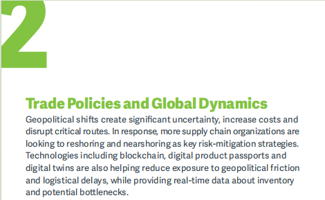 【图源:ASCM《Top 10 Supply Chain Trends in 2026》】ASCM 明确指出,地缘政治、贸易政策与监管不确定性正持续推动全球供应链区域化、多元化与去集中化。企业策略已从早期的“China +1”,演进为更灵活的多区域配置模式,制造与供应网络向墨西哥、越南、中东欧、非洲等地分散,以降低关税、出口管制和地缘摩擦带来的系统性风险。这一趋势在美欧企业中尤为明显。对中国而言,这并不等同于被“替代”。中国制造仍具备完整产业生态、基础设施效率与技术密度优势,在全球供应链中仍是关键节点。但同时,部分中低附加值环节外移、海外市场对中国直接依赖下降,已成为现实压力。中国企业需以数据和AI 工具量化区域综合成本与地缘风险,通过多节点、近岸与友岸配置提升韧性,并以自动化、本地化和长期合作对冲政策与成本波动。成功者将强化全球影响力,失败者则可能陷入供应链碎片化与竞争被动。