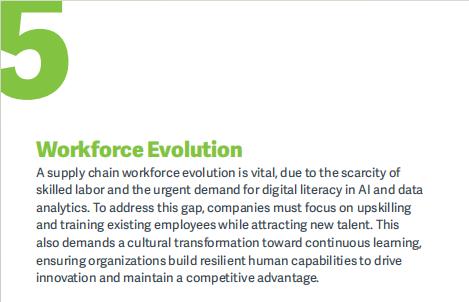 【图源:ASCM《Top 10 Supply Chain Trends in 2026》】ASCM指出,AI不仅是提升预测准确率或优化仓储路径的技术手段,更是企业实现差异化竞争的战略引擎。通过融合机器学习、生成式AI与数字孪生,企业能构建实时响应、自我调优的智能运营体系。在快消品行业,生成式AI已用于快速迭代产品配方,大幅缩短上市周期;预测分析则显著降低库存浪费。但转型并非一蹴而就——企业需先完成数据治理,打破孤岛,建立单一真实数据源,并同步培养具备AI素养的人才团队。唯有如此,AI才能真正从“算法”转化为“价值”。