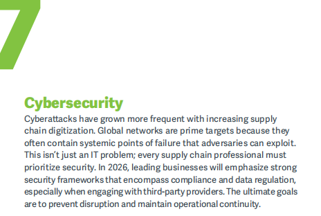 【图源:ASCM《Top 10 Supply Chain Trends in 2026》】ASCM警示:网络安全已非IT部门专属议题,而是关乎业务连续性的战略要务。现代威胁常通过第三方供应商渗透,因此企业必须实施网络隔离,将ERP系统与外部接口严格分离,并对所有数据交换强制多因素认证。第三方物流(3PL)服务商尤其关键——领先企业已将高级安全作为核心服务,以保障客户订单不被中断。未来,企业需建立覆盖整个供应商网络的持续风险评估机制,无论是软件提供商还是第四方合作伙伴,都应纳入安全审计范围。