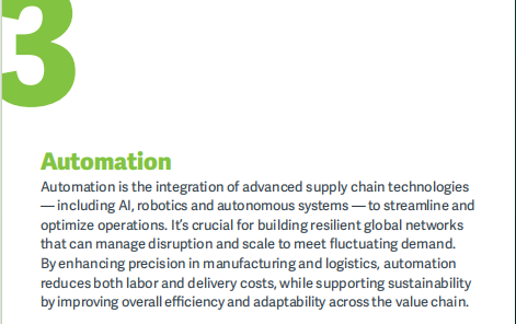 【图源:ASCM《Top 10 Supply Chain Trends in 2026》】自动化已超越“替代人力”的初级阶段,进化为构建抗干扰、可扩展供应链网络的核心能力。ASCM强调,真正的自动化是AI、机器人与自主系统的深度融合。在电商物流中心,智能拣选系统提升吞吐效率;在最后一公里,无人机与自动驾驶卡车正突破交通瓶颈,尤其惠及偏远地区。企业需重构业务流程以适配自动化逻辑,而非简单叠加于旧系统之上。唯有如此,自动化才能从“炫技”走向“实效”,在通胀压力下持续释放降本增效红利。