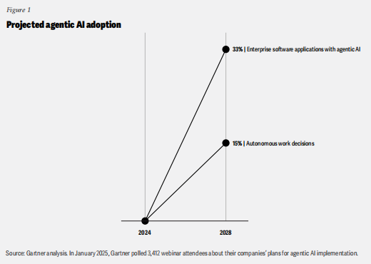 而第三方机构Gartner在2025年发布的预测则给出了更长远的预期:到2028年,33%的企业软件应用将包含agentic AI(当前不足1%),15%的日常决策将通过agentic AI自主完成(2024年为0%)。