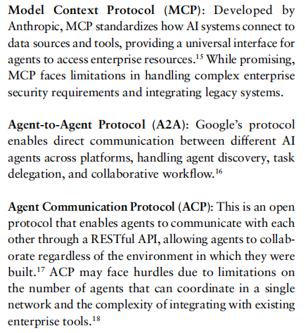 AI Agent要实现跨域协同价值,编排协议是核心技术底座。德勤报告观察到,当前有三类Agent通信协议处于探索阶段,共同构成"AI微服务架构的基础层",但均存在尚未解决的局限: