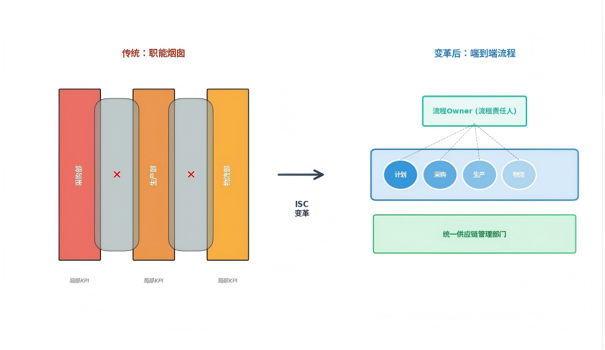 通过组织重构将割裂的职能重组为贯通的流程链,用统一的标准流程语言(SCOR的Plan-Source-Make-Deliver-Return)取代部门本位主义,实现跨部门协同而非单点最优。